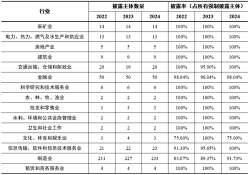 從所有制類別來看,2022至2024年度,國有控股上市公司強(qiáng)制披露主體的披露率均高于民營企業(yè)、公眾企業(yè)等。2024年度,非國有企業(yè)強(qiáng)制披露主體的披露率已達(dá)90.48%(209家),國有企業(yè)的強(qiáng)制披露主體的披露率為99.45%(180家)。