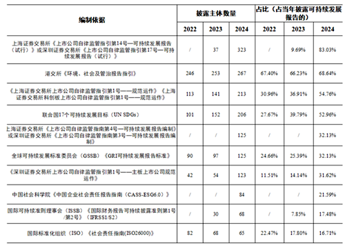 在編制依據(jù)方面,2024年度,389家已披露可持續(xù)發(fā)展相關(guān)報告的強(qiáng)制披露主體中,披露遵照《上市公司可持續(xù)發(fā)展報告指引》編寫報告的公司占比達(dá)83.03%(323家)。除前述指引外,香港交易所《環(huán)境、社會及管治報告守則》、滬深證券交易所上市公司規(guī)范運作指引、聯(lián)合國可持續(xù)發(fā)展目標(biāo)(UN SDGs)是其他主要的可持續(xù)發(fā)展報告編制依據(jù)。