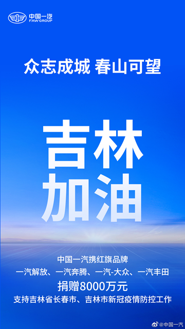 3月17日,“中國一汽”微博宣布攜旗下紅旗品牌、一汽解放、一汽奔騰、一汽-大眾、一汽豐田共捐贈現(xiàn)金8000萬元,用于支持吉林省長春市、吉林市疫情防控工作。