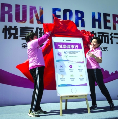▲上海羅氏制藥有限公司總經(jīng)理周虹與中國(guó)預(yù)防性病艾滋病基金會(huì)副理事長(zhǎng)馬純鋼帶羅氏員工志愿者一同義走