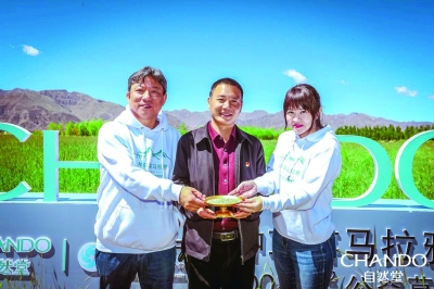 張波副縣長(中)為自然堂公益一行贈送草籽2019年7月,伽藍集團公關(guān)傳播總經(jīng)理陳涓玲再次踏足西藏這片神圣的土地。