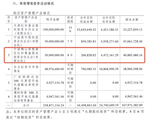 《財(cái)報(bào)》顯示,南都公益基金會(huì)購買資管產(chǎn)品共計(jì)6支,分別為:長期股權(quán)投資資管產(chǎn)品——“天津紅杉基業(yè)股權(quán)投資合伙企業(yè)(有限合伙)”投資金額1億元,投資期限15年;“寧波禹禾股權(quán)投資合伙企業(yè)(有限合伙)”投資金額5000萬元,投資期限7年;“寧波梅山保稅港區(qū)紅杉慧盛股權(quán)投資合伙企業(yè)(有限合伙)”投資金額5000萬元,投資期限8年。