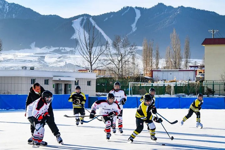 2022年1月12日,烏魯木齊縣第一中學(xué)小學(xué)部冰球隊(duì)的學(xué)生在進(jìn)行冰球比賽。圖片來源:新華社