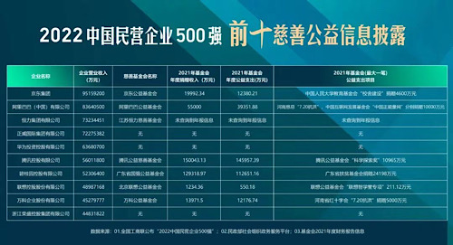 《公益時(shí)報(bào)》記者通過檢索10家企業(yè)官網(wǎng)及中國社會(huì)組織政務(wù)服務(wù)平臺(tái)發(fā)現(xiàn),“2022中國民營企業(yè)500強(qiáng)”前十名有七家設(shè)有企業(yè)基金會(huì),三家入選首批互聯(lián)網(wǎng)公開募捐信息平臺(tái)。具體包括,京東集團(tuán)設(shè)立的京東公益基金會(huì)、阿里巴巴集團(tuán)設(shè)立的阿里巴巴公益基金會(huì)、恒力集團(tuán)設(shè)立的江蘇恒力慈善基金會(huì)、騰訊集團(tuán)設(shè)立的騰訊公益慈善基金會(huì)、碧桂園設(shè)立的廣東省國強(qiáng)公益基金會(huì)、聯(lián)想控股設(shè)立的北京聯(lián)想公益基金會(huì)以及萬科設(shè)立的萬科公益基金會(huì)。